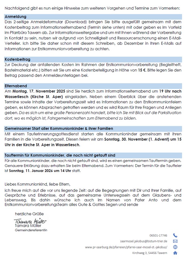Die Vorbereitung auf die Erstkommunion ist eine besondere Zeit. Gemeinsam machen wir uns mit ihrem Kind und ihnen als Familie auf den Weg, Jesus immer besser kennenzulernen – in seinen Geschichten, in Gespräch miteinander, in der (Gottesdienst-)Gemeinschaft. Schritt für Schritt entdecken wir, was er uns in der Eucharistie schenken möchte: seine Liebe, seine Freundschaft und das Vertrauen, dass er immer mit uns geht.